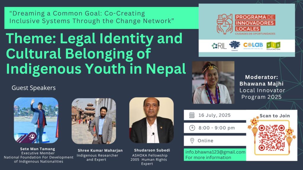The Disability Human Rights Promotion Society Nepal (DHRPS), in collaboration with AYNI under the Local Innovators 2025 Program, recently organized an engaging and participatory webinar titled “Dreaming a Common Goal: Co-Creating Inclusive Systems Through the Change Network”. The event centered around the theme “Legal Identity and Cultural Belonging of Indigenous Youth in Nepal” and brought together Change Network members, Indigenous leaders, youth, experts, and facilitators for an in-depth discussion and knowledge exchange.